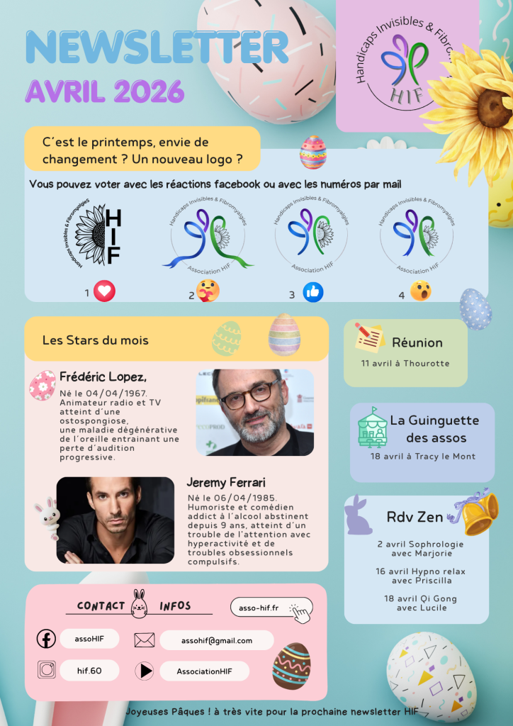 Handicaps Invisibles et Fibromyalgies, c’est volontairement que nous avons rajouté un S à fibromyalgie, considérant qu’il n’y en a pas qu’une, que les causes peuvent être diverses et variées, telle la Maladie de Lyme, les Syndromes d’Ehlers-Danlos (SED), la Myofasciite à Macrophages, l’Encéphalomyélite Myalgique (EM/SFC), la Polyarthrite Rhumatoïde, Spondylarthrite Ankylosante, les Maladies Inflammatoires Chroniques de l’Intestin (MICI), le Syndrome du Défilé Thoraco Brachial (SDTB), Covid long…
